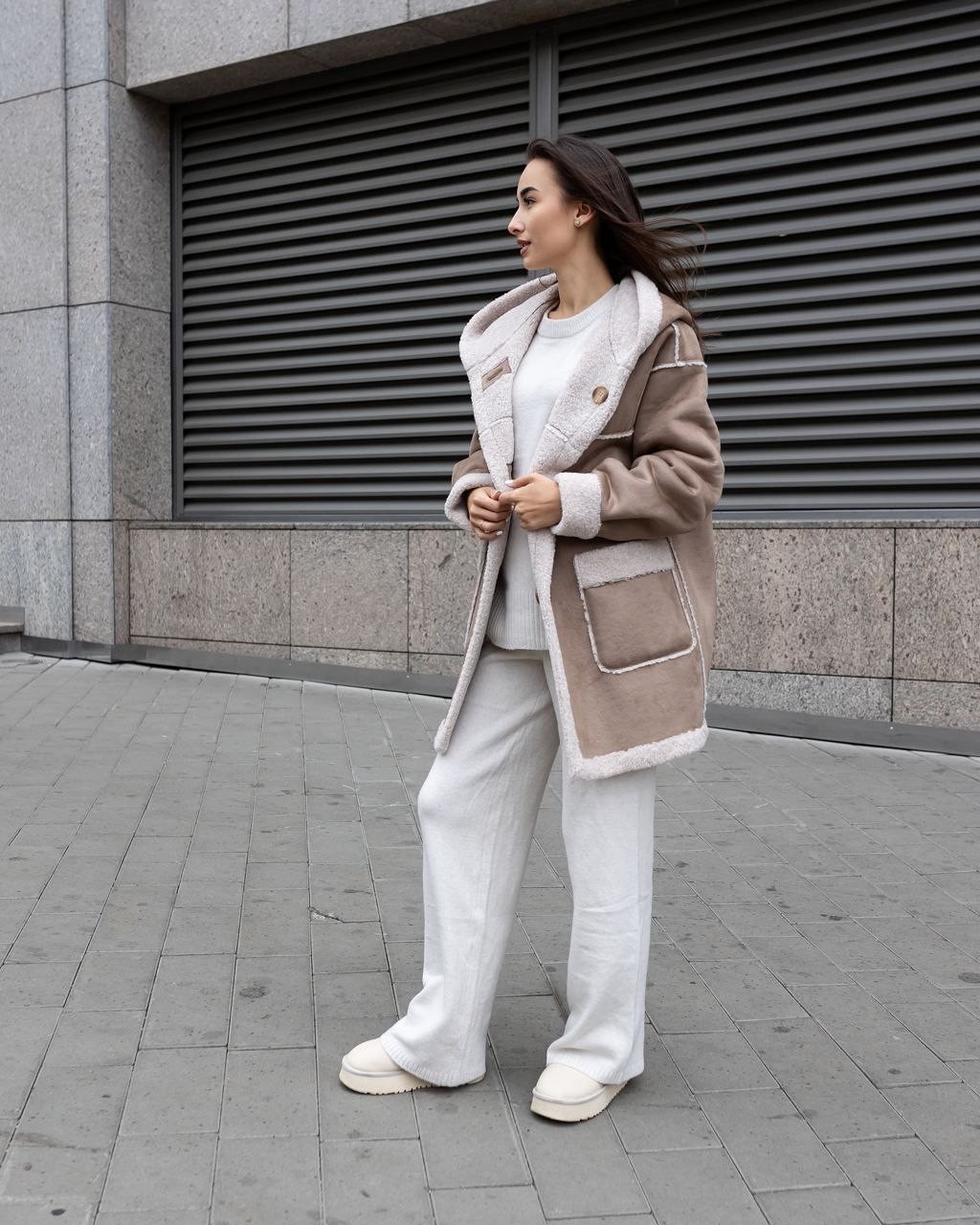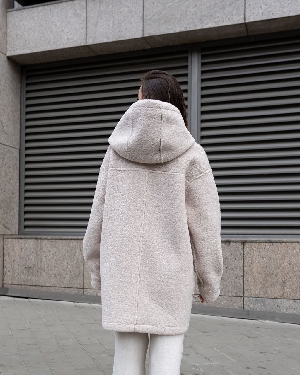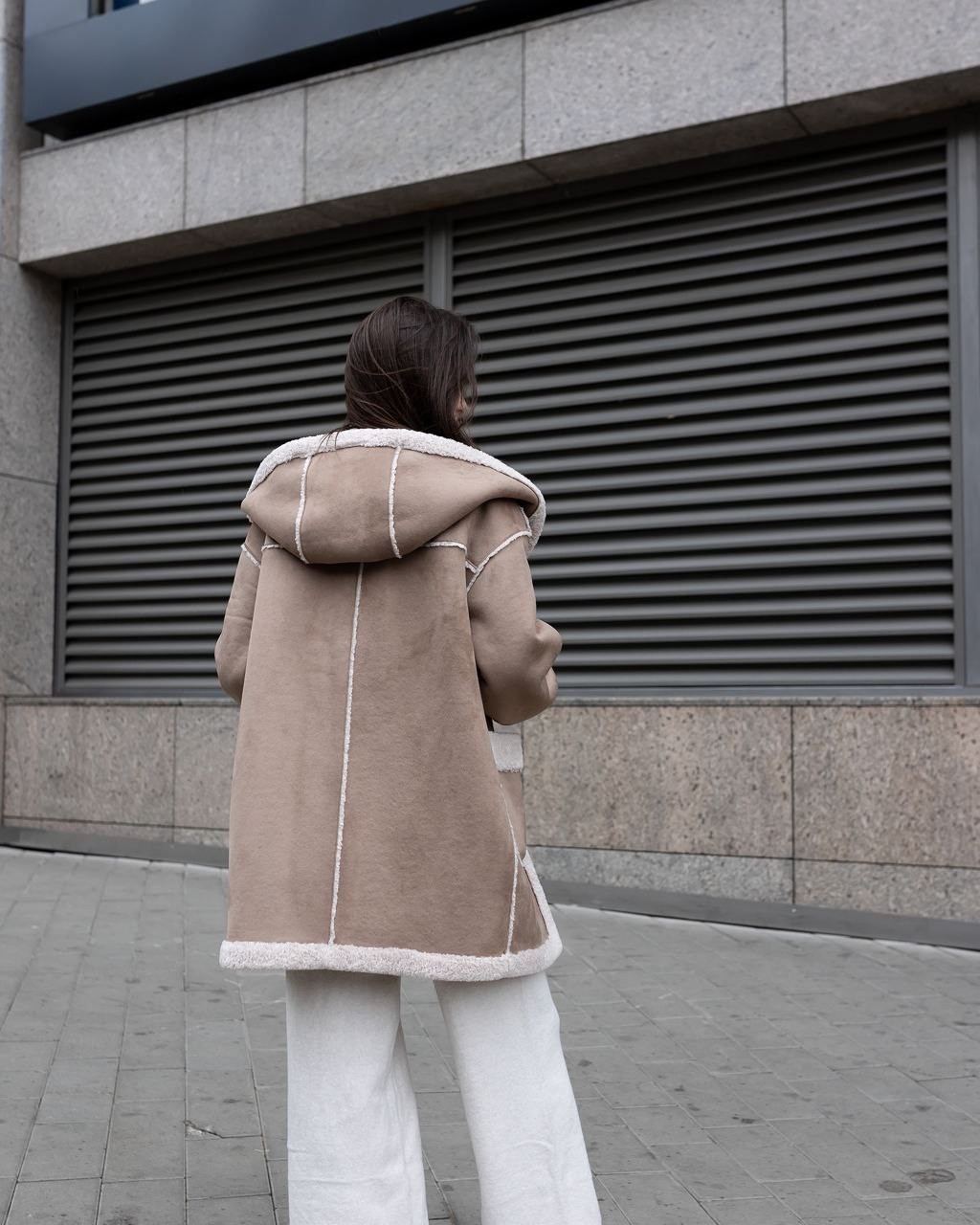 Reversible shearling coat Icelandia with hood — a stylish and practical choice for the cold season. The outer side is crafted from suede, while the inner side features warm shearling, allowing the coat to transform easily and suit different looks. Its relaxed fit ensures comfort, and the hood adds extra warmth and coziness.