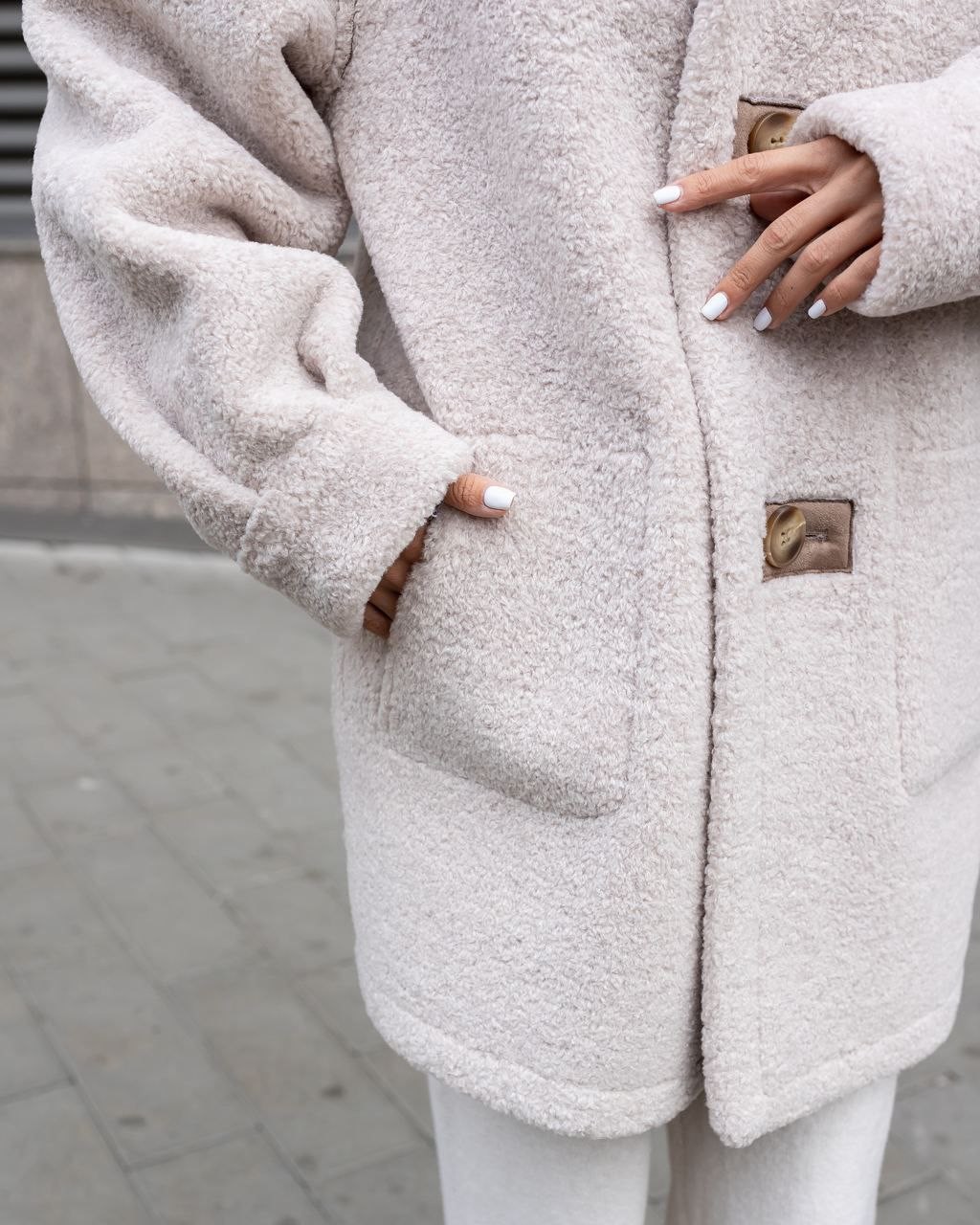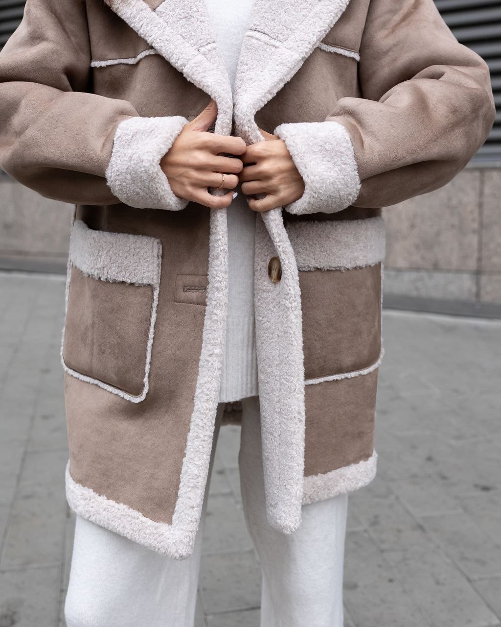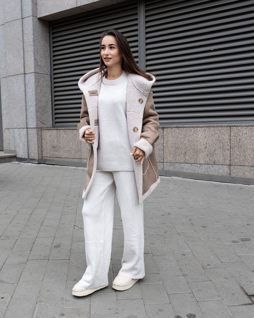 Reversible shearling coat Icelandia with hood — a stylish and practical choice for the cold season. The outer side is crafted from suede, while the inner side features warm shearling, allowing the coat to transform easily and suit different looks. Its relaxed fit ensures comfort, and the hood adds extra warmth and coziness.