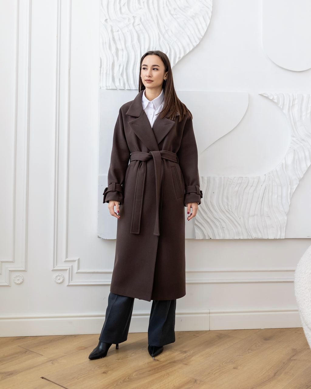 Oversized cashmere coat with a one-piece “batwing” sleeve. The design provides comfort, freedom of movement, and an elegant fit for any body type.