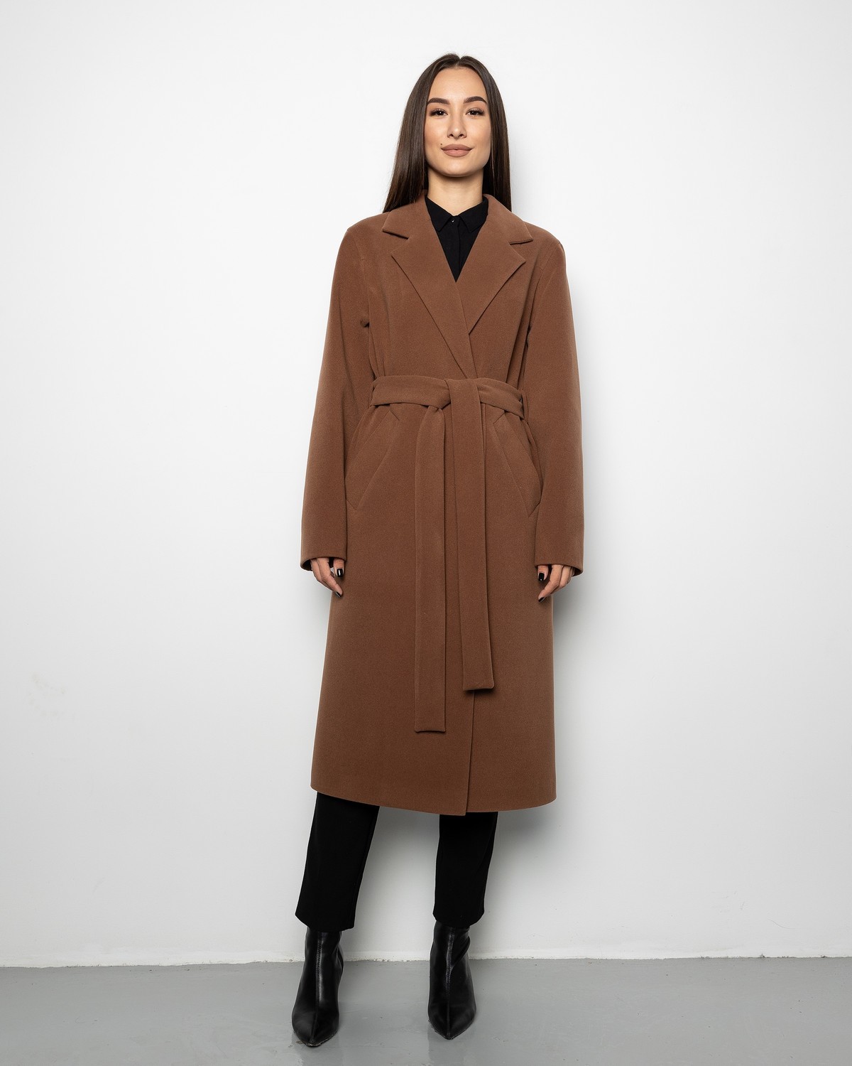 Tequila Coat — elegant classics with a modern twist. Minimalist cut, midi length, and a focus on the waistline with a belt. This refined wrap coat easily complements a basic wardrobe and adds a touch of understated femininity to any look.