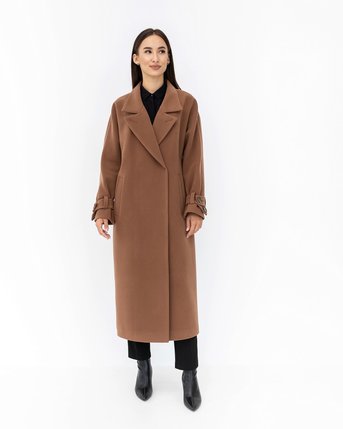 Оверсайз пальто из кашемира с цельнокроеным рукавом типа «летучая мышь». Модель обеспечивает комфорт, свободу движений и элегантную посадку на любую фигуру.