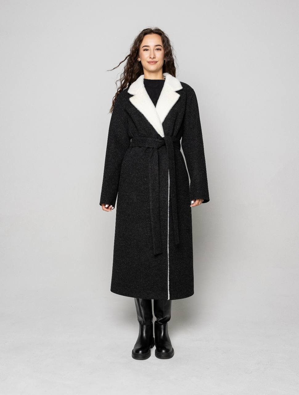 Элегантное зимнее пальто прямого кроя в оттенке графит, украшенное молочной ангорой. Выполнено из меланжевой ткани и утеплено современным материалом, обеспечивающим комфорт и тепло в холодное время года.