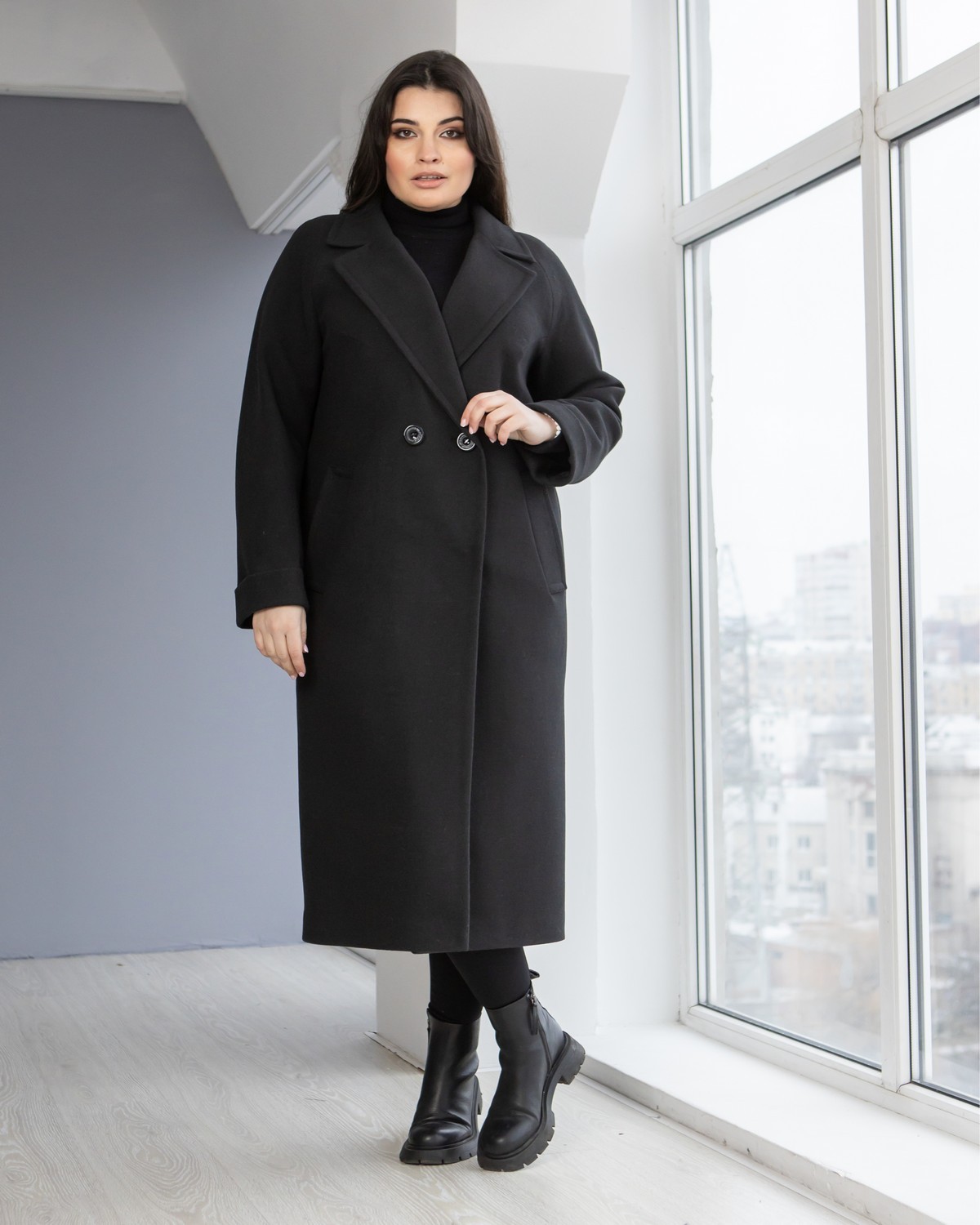 Длинное пальто свободного кроя. Рукав цельнокроеный. Длину рукава можно регулировать манжетом. Пояс в комплекте. Пальто застёгивается на 2 пуговицы + 1 пришивная кнопка. На лацкане предусмотрена петелька для застёгивания воротника, обеспечивая дополнительную защиту от холода.