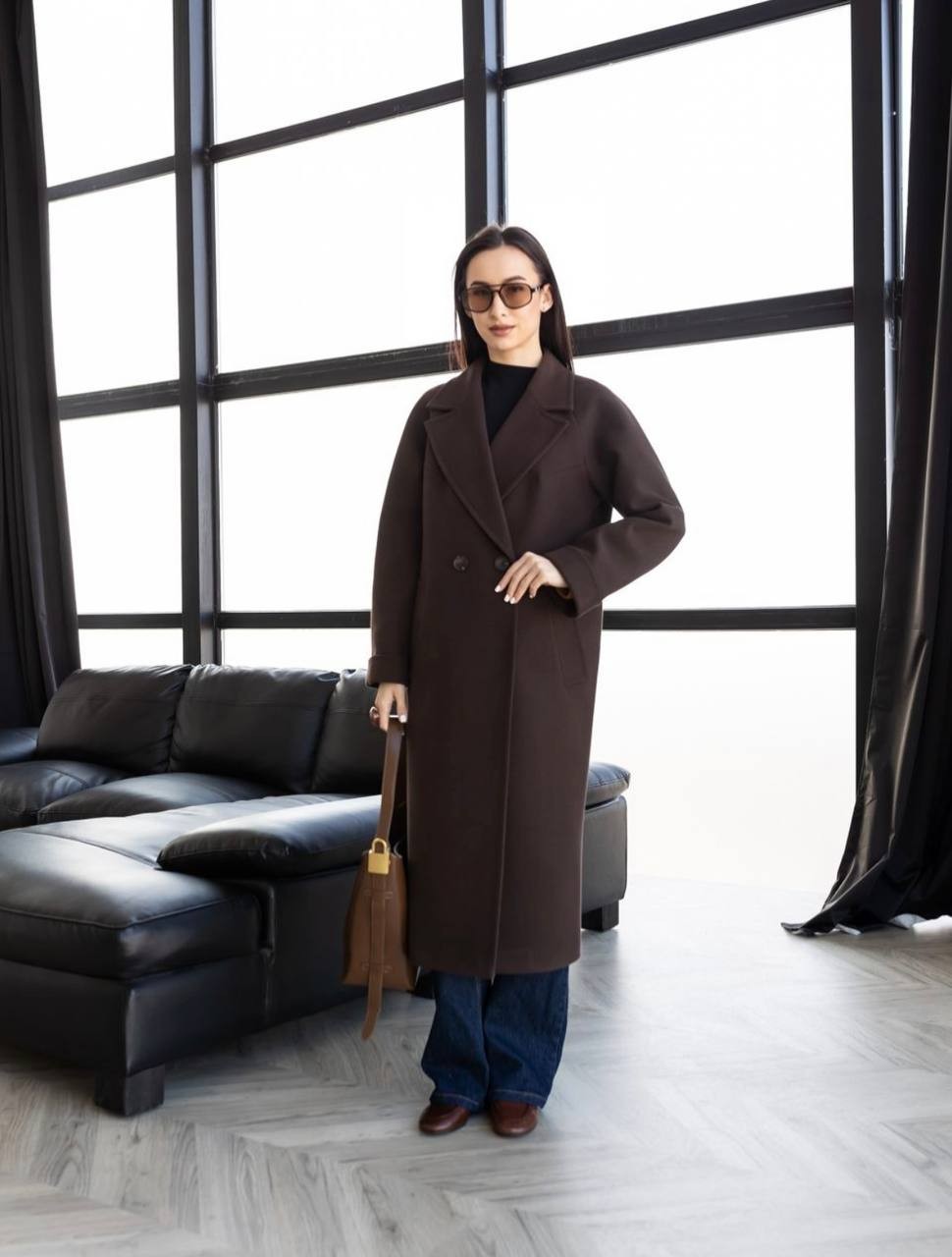 Довге пальто вільного крою. Рукав цільнокрійний. Довжину рукава можна регулювати манжетом. Пояс у комплекті. Пальто застібається на 2 ґудзики + 1 пришивна кнопка. На лацкані передбачена петелька для застібання коміра, забезпечуючи додатковий захист від холоду.