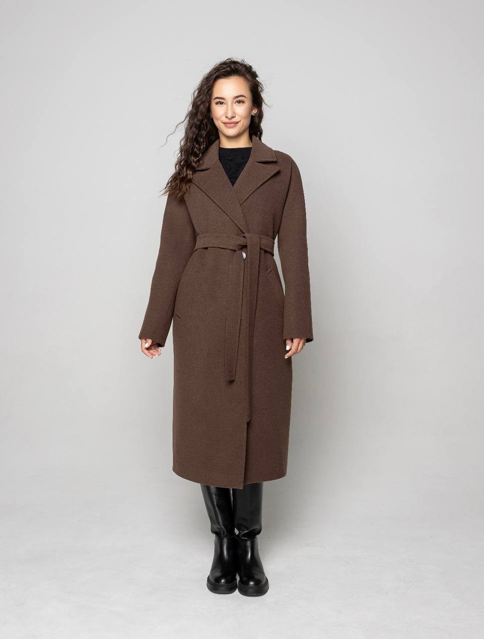 Демісезонне пальто прямого крою з поясом. Лаконічний силует та універсальний шоколадний відтінок створюють стильний образ на кожен день.