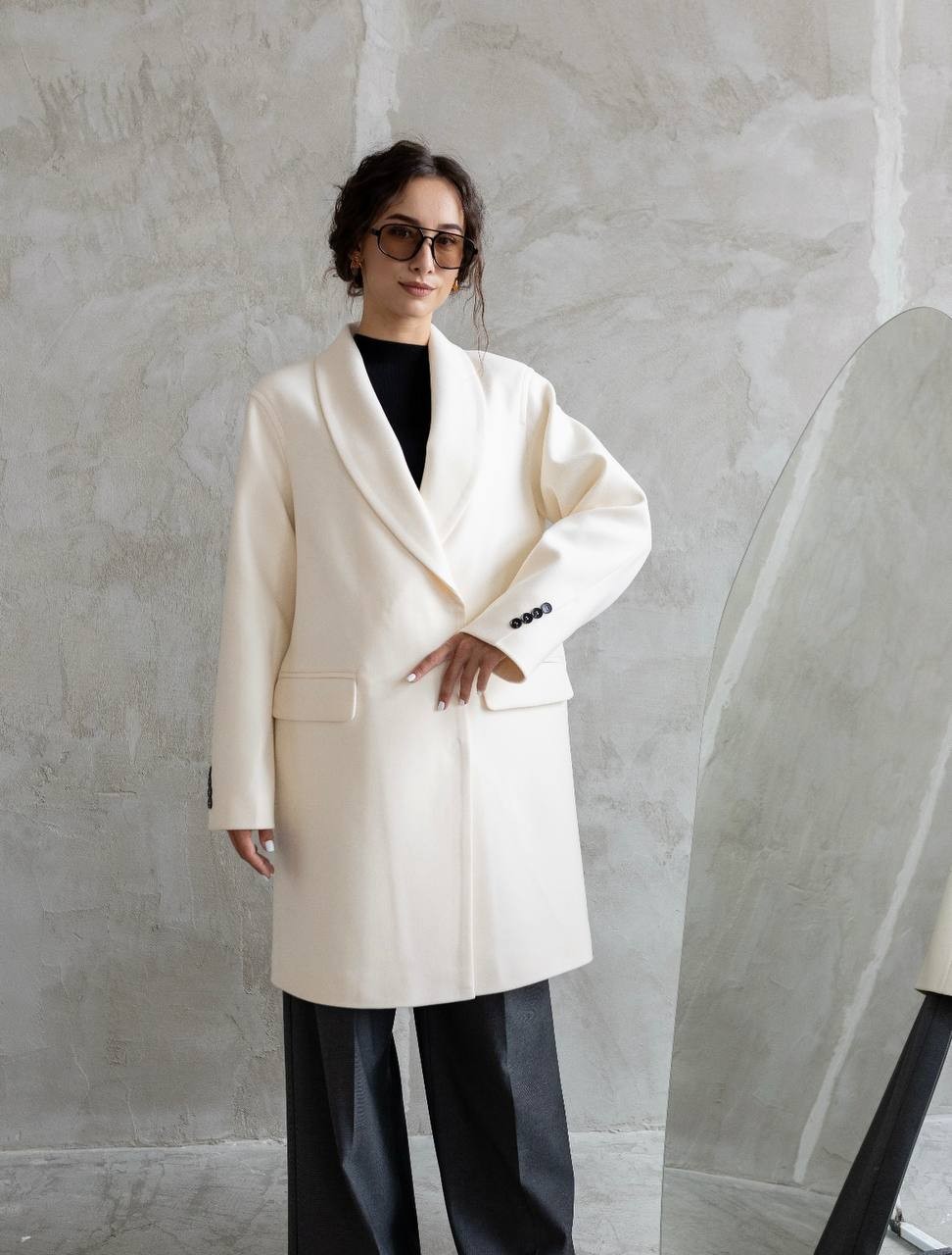 Елегантне пальто рівного крою з м’яким плечем та оригінальним кроєм рукава. Тонкий пасок підкреслює талію, а сучасний комір можна викладати у різних варіантах. Довжина моделі — 90 см, що робить її зручним вибором для щоденного носіння