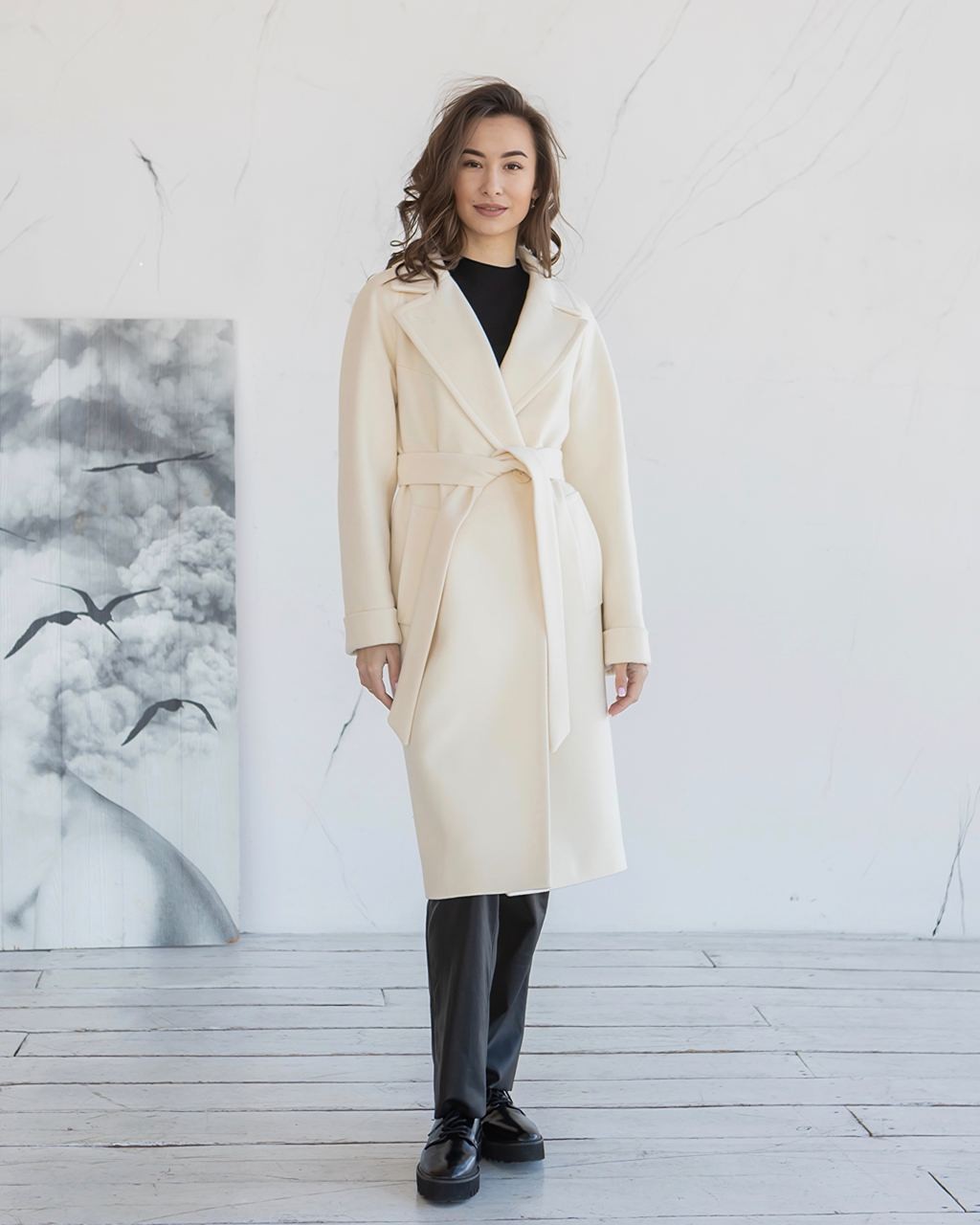 Пальто вільного крою середньої довжини. Рукав цільнокрійний. Довжину рукава можна регулювати манжетом. Пояс у комплекті. Пальто застібається на 2 ґудзики + 1 пришивна кнопка. На лацкані передбачена петелька для застібання коміра, забезпечуючи додатковий захист від холоду.