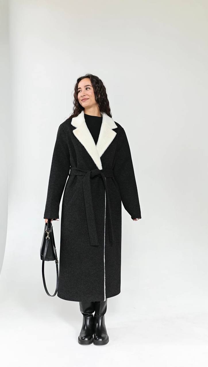 Елегантне зимове пальто прямого крою у відтінку графіт, оздоблене ангорою молочного кольору. Виконане з меланжевої тканини та утеплене сучасним матеріалом, що забезпечує комфорт і тепло в холодну пору року.